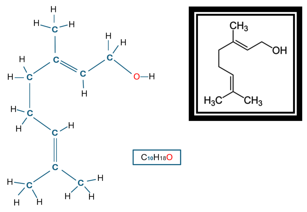 El Geraniol tiene una estructura química de C₁₀H₁₈O y contiene dos unidades de Prenilo y un grupo Hidroxilo (OH). Con una masa molecular de 154,253 g·mol−1 y un punto de ebullición de 230°C (446 °F), el Geraniol es un compuesto bastante volátil; característica propia de los monoterpenos.