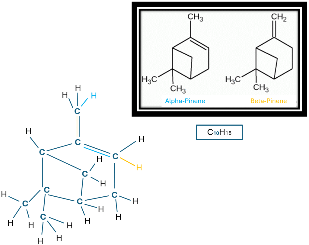 As a monoterpene, Pinene is a small, volatile compound made up of just two isoprene units (the building blocks of Terpenes).