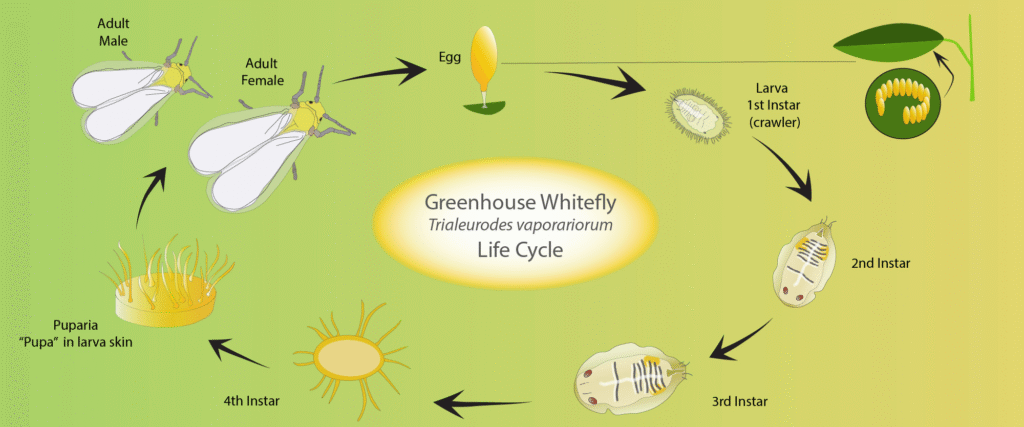 They reproduce by laying 180-200 eggs on the underside of leaves each egg laying. The eggs are almost microscopic and yellowish-white color. They have four generations per year, depending on climatic and hygiene conditions. Indoors and in greenhouses, they can produce up to ten generations per year, making them a serious pest.